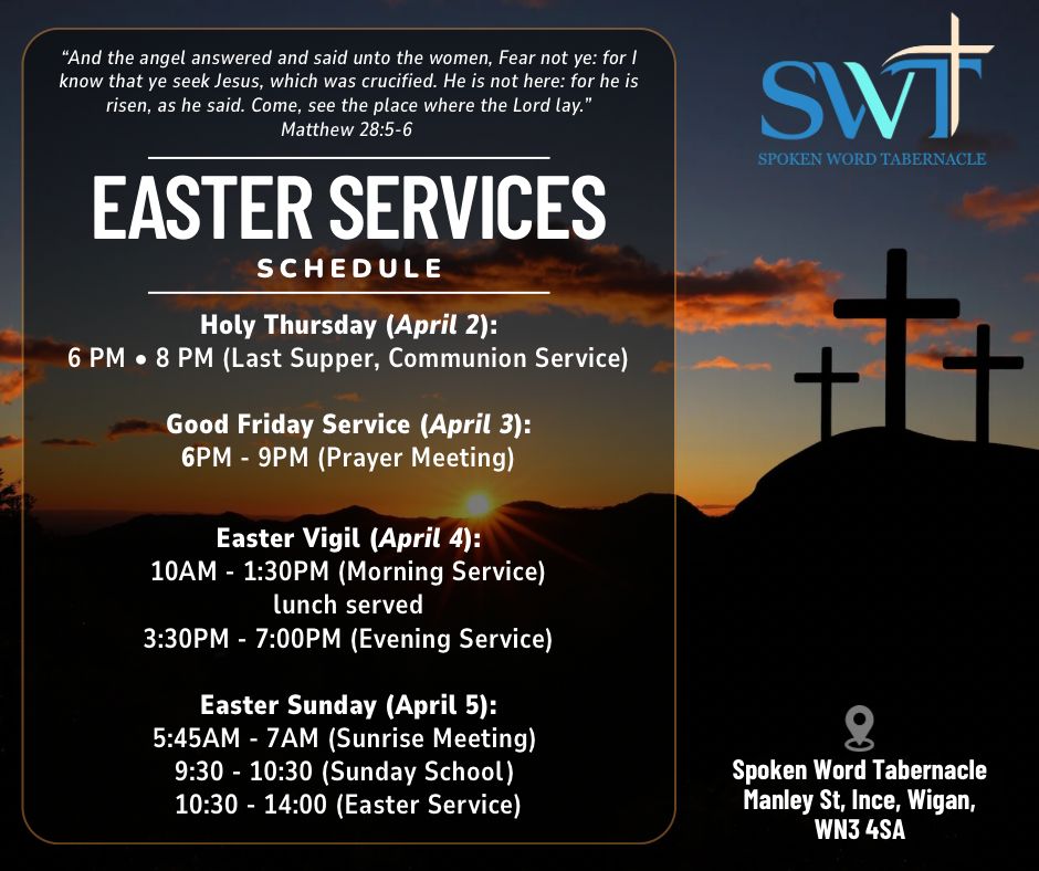 We are a Message Believing church based in Ince, Wigan. Founded by Pastor Faustin Tshunza L, we are dedicated to preaching the full gospel of salvation, divine healing, holiness and preparing believers for the soon return of Jesus Christ. Spoken Word Tabernacle is an End Time church, believing firmly in the Message of the hour given to us by God through His prophet, William Marrion Branham. Our foundation is built on the belief that Jesus Christ is the Chief Cornerstone and the Headstone of the church.